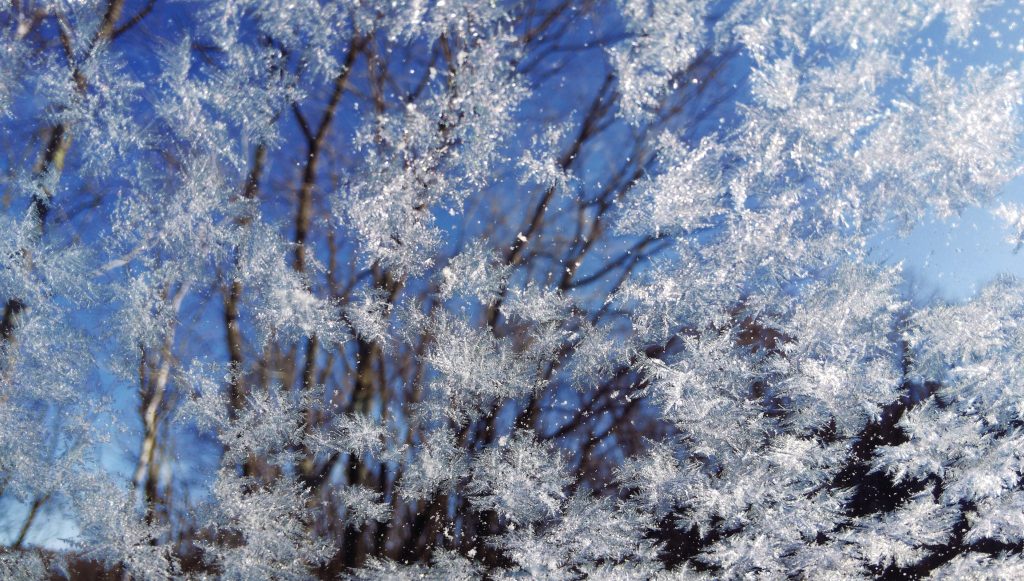 車のガラスについた雪の結晶と車外に見える木で樹氷が面白い。