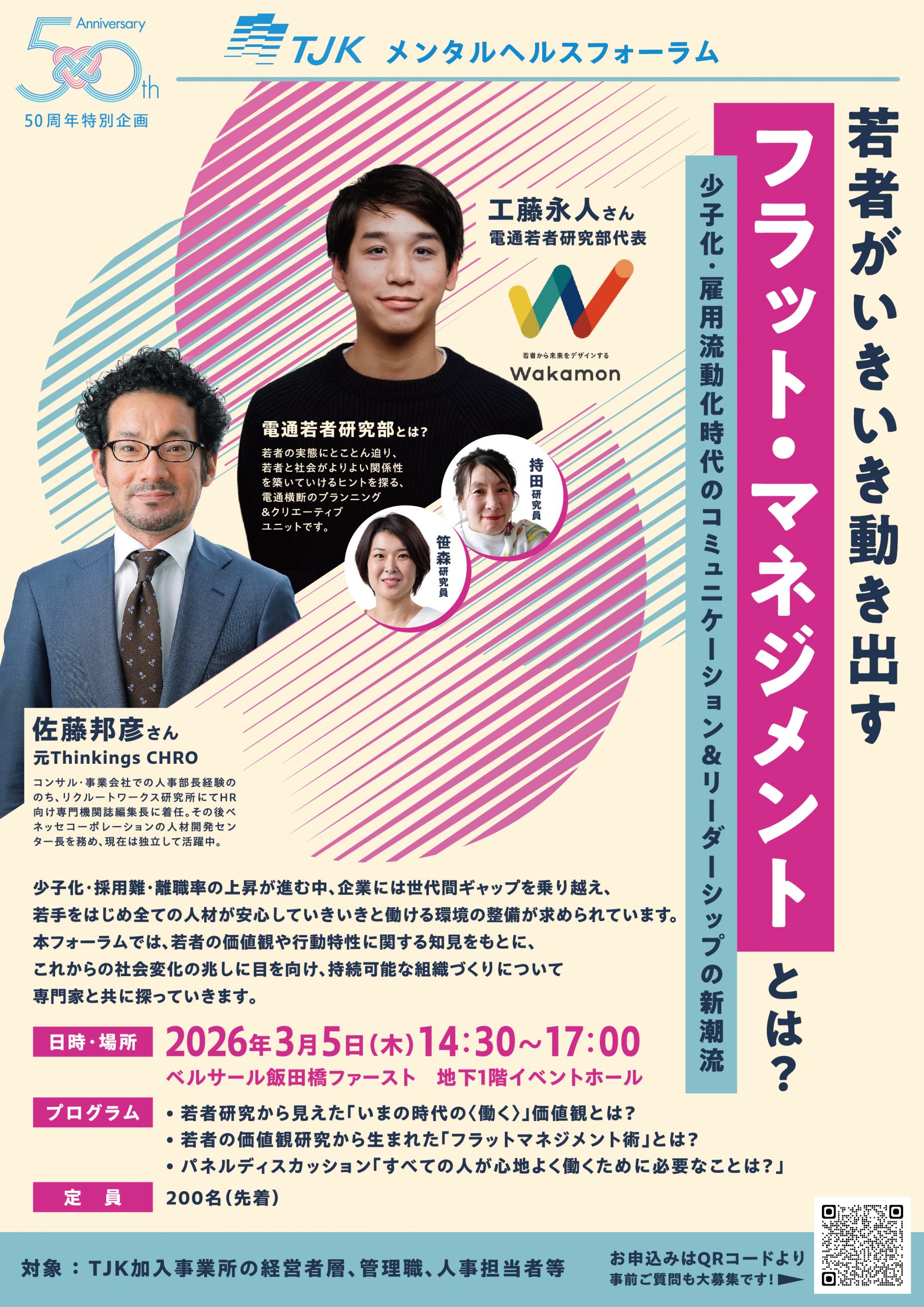 ◇若者研究から見えた「いまの時代の〈働く〉」価値観とは?◇若者の価値観研究から生まれた「フラットマネジメント術」とは?◇パネルディスカッション「すべての人が心地よく働くために必要なことは?」出演者一覧・工藤 永人 氏 電通若者研究部代表 ・電通若者研究部「Wakamon」・佐藤 邦彦 氏 元Thinkings CHRO・山﨑 友丈 氏 TJKメンタルヘルスセンター所長 |
