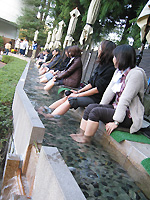 最初の目的地は、15分ほど歩いたところにある足湯スペース。ここで、足湯に浸かりながらできる簡単な体操が指導されました。