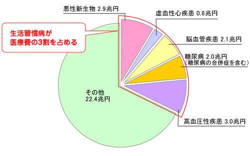 次に、医療費の面から見てみましょう。平成17年度の医療費の内訳を見てみると、国民医療費33.1兆円のうち、生活習慣病によるものが10.7兆円。つまり、医療費の約3割を生活習慣病が占めているのです。死因別の死亡割合を見てみますと、約6割を生活習慣病が占めています。