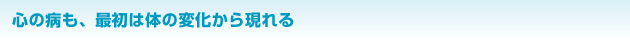 実は、心の問題を抱えている人というのは、まず最初、体からくるんです。自分自身で自覚できていないだけであって、実は体から始まっているんです。体の不調を抱えている人は、そこから心の方にいくケースが非常に多い。ところが、最初の段階の体調不良、ここを見逃してしまう人が少なくないんですね。