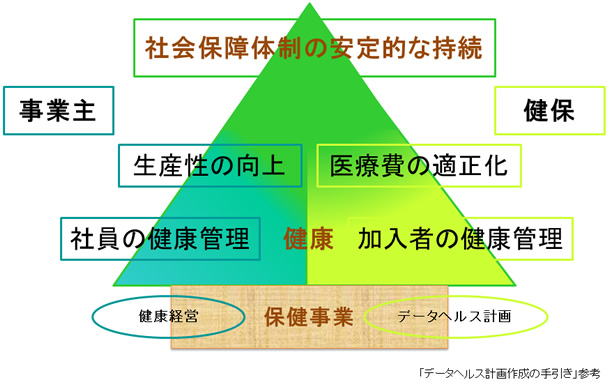図(1)は、社会保障体制の安定的な持続はどのように成り立っているかを表わしたものです。会社は生産性の向上と社員の健康管理、健保は医療費の適正化と加入者の健康管理という役割を担っています。それらを幹となって支えているのが、保健事業ということになります。言い換えれば、保健事業により社員や加入者の健康を管理し、生産性の向上や医療費の適正化につなげることで、社会保障体制の安定的な持続が可能となる、ということです。