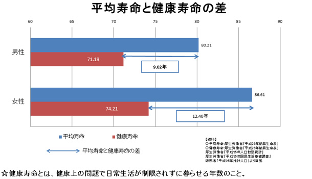 図(2)は、平均寿命と健康寿命との差を示したものです。その差は、男性では9.02年、女性では12.40年となっており、その間は介護を必要とするなど、何らかの制限を受けて暮らすことになります。