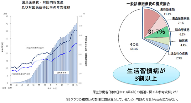 図(4)は、国民医療費と、国内総生産および国民所得に対する国民医療費の比率の年次推移を示したものです。いずれも、年々増え続けていることがわかります。