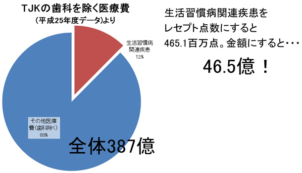 TJKの医療費をみてみると、歯科を除く医療費は全体で387億円となっています。そのうち、生活習慣病関連疾患は12%を占めており、金額にすると46.5億円もの医療費がかかっています[図(6)]。