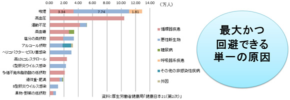 図(8)は国が行なった調査結果で、リスク要因別に関連死亡者数を示したものです。縦軸がリスク要因で、棒グラフは死因となった疾患別に色分けしています。喫煙は、リスク要因の1位となっており、そのうちでもっとも多い疾患が悪性新生物(がん)となっています。