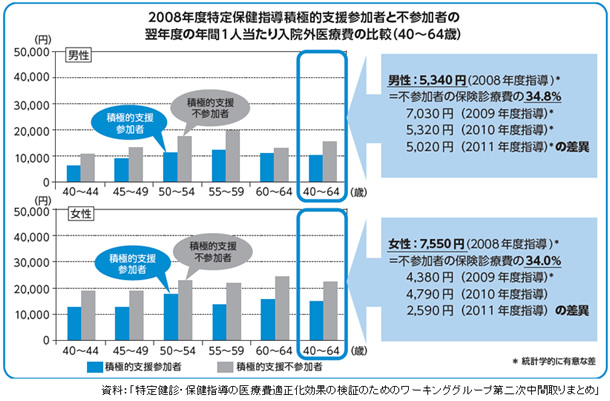 また、積極的支援参加者と不参加者で、医療費を比較したのが図(11)です。40~64歳の平均値でみてみると、両者の差額は、男性で5,340円、女性で7,550円となっています。つまり、積極的支援に参加した人の方がこれだけ医療費を抑えられているということです。
