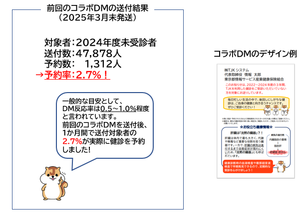 この度、事業主様とTJKのコラボヘルス施策として、2025年度にTJKを利用した健診を受診(予約)していない方を対象に、コラボDMを送付いたします。事業主様とTJKが連名でご案内することにより、大切なご自身のお身体に関心を持ち、健診を受診していただくことを目指しております。社員の皆さまとご家族が健康に過ごしていただくため、年に1回の健診が習慣となるよう、コラボDMの送付にご賛同お願い申し上げます。