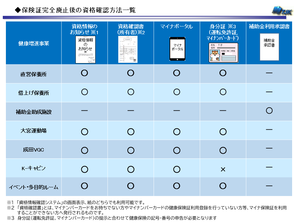 ご利用の施設によって確認方法が異なりますので、ご確認のうえご利用の際には必要なものをお手元にご用意いただきますようお願い申し上げます。(下記一覧の○印のものいずれか1点ご用意ください。)