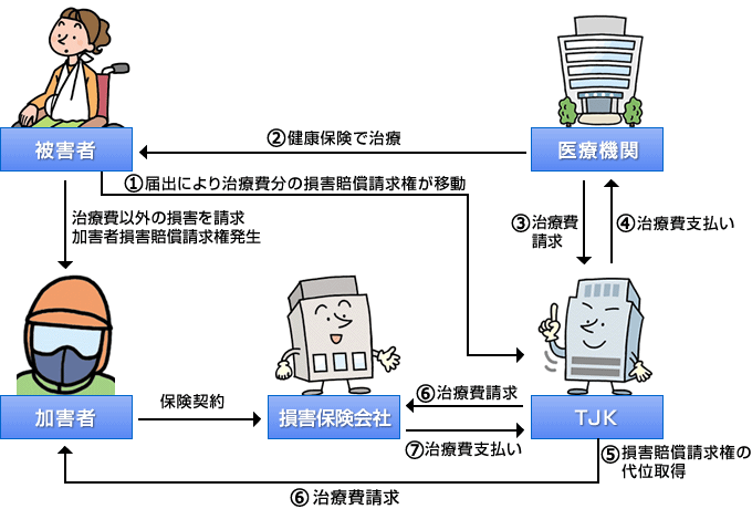 健康保険で診療を受けたときは、必ず第三者行為相談室に連絡するとともに、必要書類を提出してください。届出があってはじめて、TJKが加害者に支払った医療費などを請求することができます。