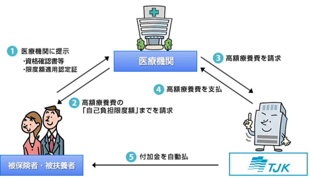 TJKでは「限度額適用認定証」または「限度額適用・標準負担額減額認定証」を提示した後の自己負担残額に対して「付加金」が支給されます