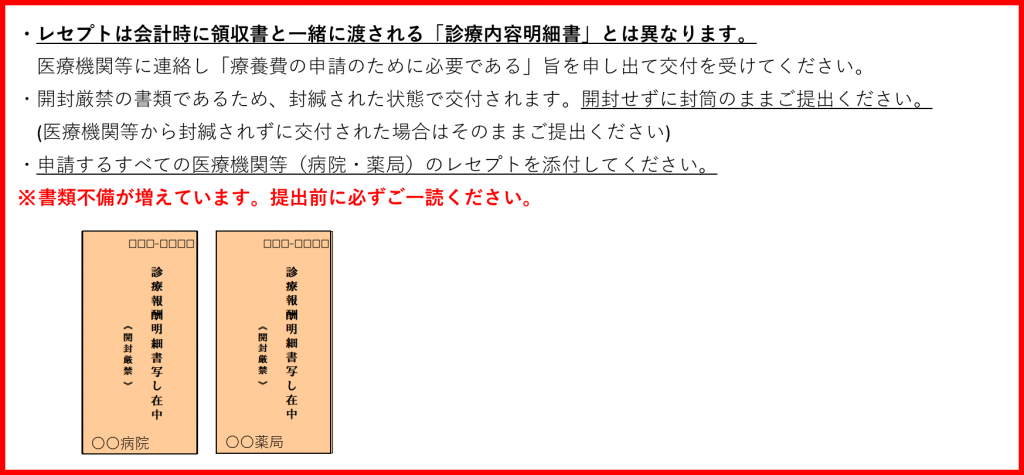「診療明細書」は、「診療報酬明細書(レセプト)」ではありません。記載内容が異なるため、代用することができません。「療養費」を申請する際は、必ず医療機関で「診療報酬明細書(レセプト)」の発行を依頼し、添付してください。