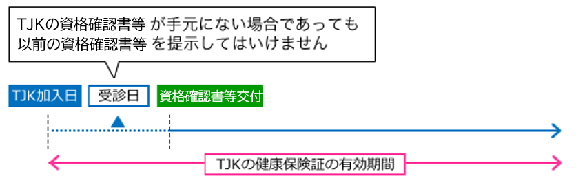 - 入社したばかりでTJKの資格確認書等が手元に届いていなかったが、ケガや病気をしてしまい以前の資格確認書等を提示して医療機関を受診した