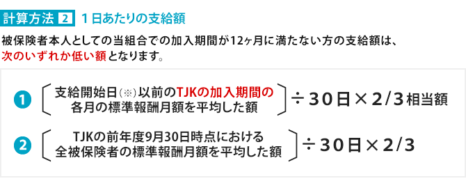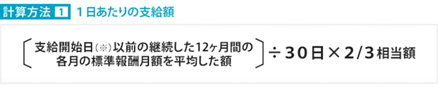 傷病手当金は皆さまの標準報酬月額に基づき支給額を決定します。計算方法は1、2のうちいずれかあてはまるものを使用します。
