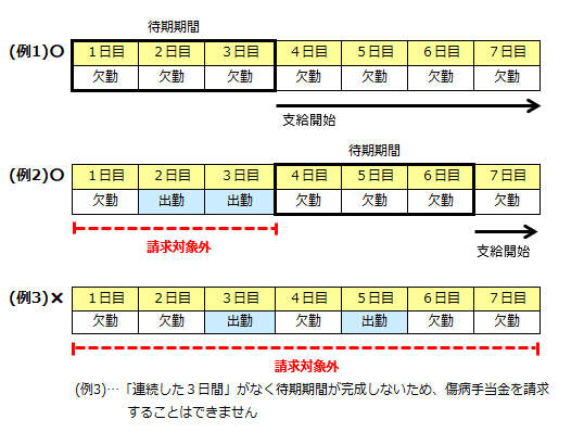 第1回目の請求では、同一の傷病の療養で3日以上連続して仕事を休んだときが対象となります。なお最初の連続した3日間は「待期期間」といって傷病手当金は支給されず、支給が開始するのは4日目以降となります。