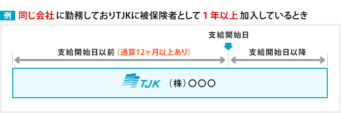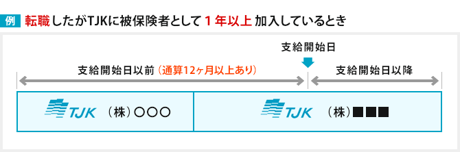 ※TJKでの資格喪失日まで、1日も空かず働く本人としての社会保険の加入期間が1年以上ある方が対象となります。転職等で短期間に加入する保険者が変更している場合は通算することができます。ただし、国民健康保険・共済組合・任意継続被保険者・被扶養者の加入期間は通算することができません。
