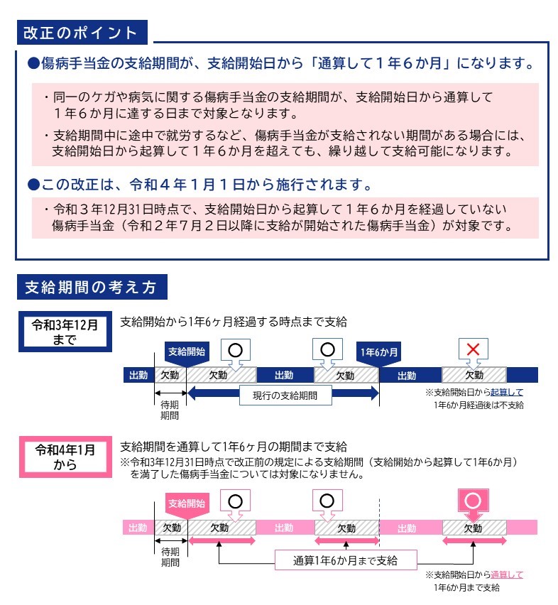 傷病手当金の支給期間については、健康保険法の改正にともない支給期間が通算化されます。法改正後の支給期間の規定は令和4年1月1日から施行されます。ただし、支給開始日によって満了日の考え方が異なりますので、下記事例をご確認ください。