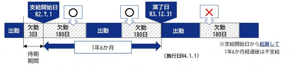 支給開始日が令和2年7月2日以降の傷病手当金は、施行日前日の令和3年12月31日時点で支給開始日から1年6か月を経過していないため、改正後の規定が適用されます。支給開始日から1年6か月の日付までの日数を総支給日数とします。支給期間は通算して考えるので、途中で就労するなど傷病手当金が支給されない期間がある場合、残りの支給日数分は支給可能です。満了日は支給日数をすべて終えた日付になります。