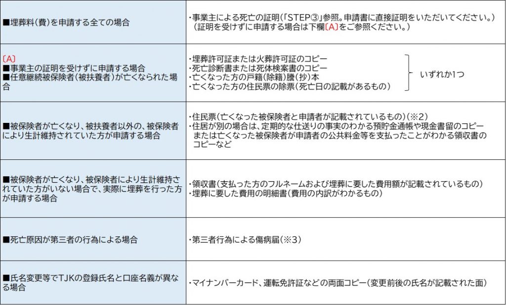 ・事業主による死亡の証明を受けずに、STEP②で添付書類〔A〕を用意する方は直接TJKにご提出ください。