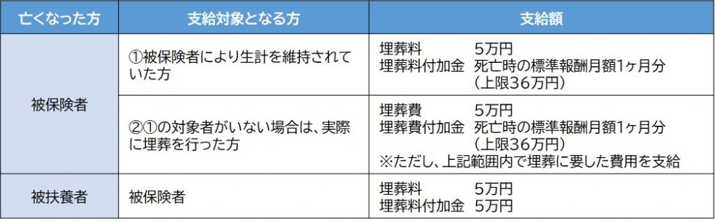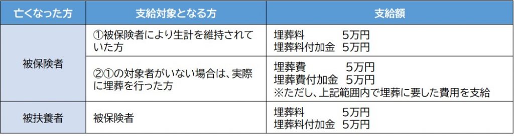 ・埋葬料を受けられる方がいない場合は、実際に埋葬を行った方に「埋葬料」「埋葬料付加金」(計10万円)の範囲内で、実際に埋葬に要した費用に相当する額が「埋葬費」「埋葬費付加金」として支給されます。