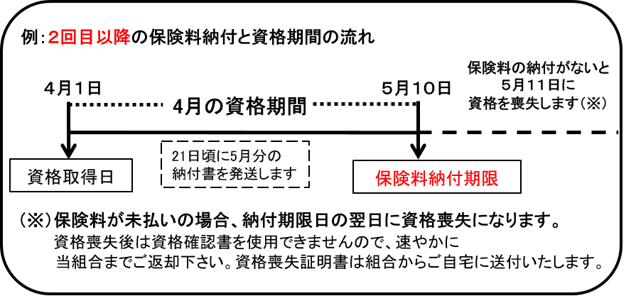 納付期限までに、初回の保険料の納付がされなかった場合、資格取得日に遡って取得取り消しとなります。取り消しとなった場合、保険診療時の医療費は、請求させていただくこととなりますので、保険料は必ず期限内に納付してください。