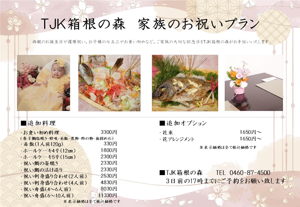 大切な日は箱根の森で!「家族のお祝いプラン」 投稿日 2023年4月5日 著者 TJK リゾート カテゴリー お知らせ カテゴリー TJK箱根の森 カテゴリー 保養施設 お誕生日やご長寿のお祝い、お食い初めなど、ご家族のおめでたい日を箱根の森でお祝いしませんか?大切な記念日をTJK箱根の森がお手伝いいたします。 ※ご予約は現地フロントまでお問い合わせください。 ご利用日3日前が休館日の場合は、その前日までの受付となります。 お問い合わせ TJK箱根の森 フロント℡. 0460-87-4500 この記事を書いた人 TJK リゾート 記事一覧 ウェブサイト