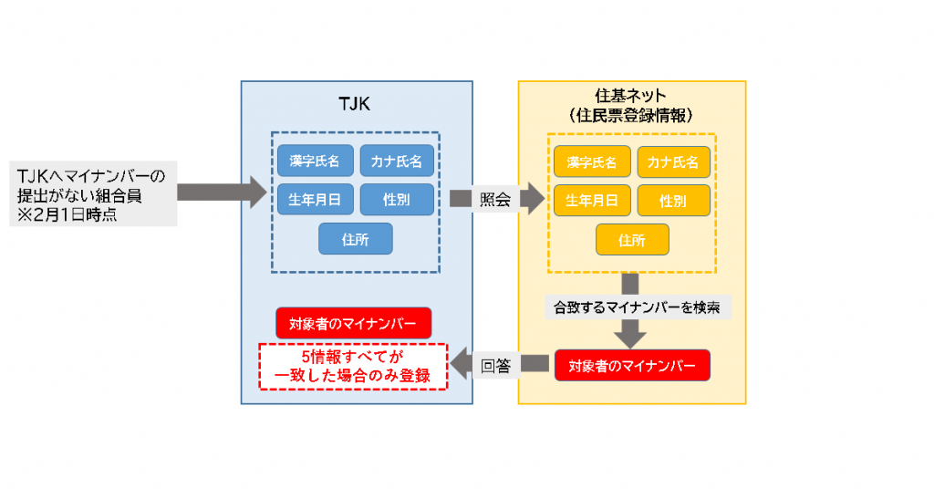 住基ネットへの照会によりマイナンバーを登録する際、誤って別人のマイナンバーを登録することのないよう、当組合では、「氏名(漢字・カナ)」「生年月日」「性別」「住所」のすべてが合致する場合のみ登録を行っています。