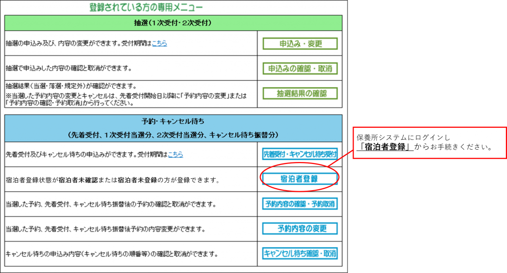 キャンセル待ちで予約が取れた場合、速やかに保養所システムへログインしていただき、宿泊者登録の手続きをしてください。