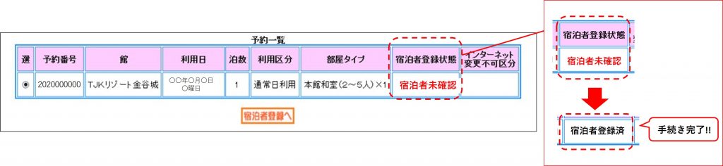 ⑤宿泊者登録状態が「宿泊者未確認」から「宿泊者登録済」へと表示が変わります。宿泊者登録済の表示に変わると、手続き完了となります。