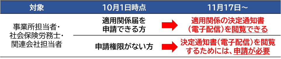 2025年10月1日時点で「適用関係届出の電子申請ができる方(事業所担当者、社会保険労務士、関連会社担当者問わず)」は、 TJKで電子配信されたデータの 閲覧権限を付与しておりますので、11月17日(月)より閲覧が可能です。閲覧権限を変更・追加したい場合は、当組合HP「電子申請のご案内」ページにございます「電子配信利用変更申請書」をご提出ください。