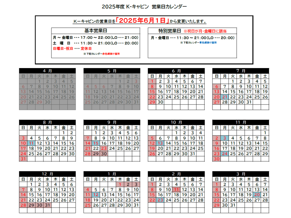 この度、より多くの方にK-キャビンをご利用いただけますよう、営業日を