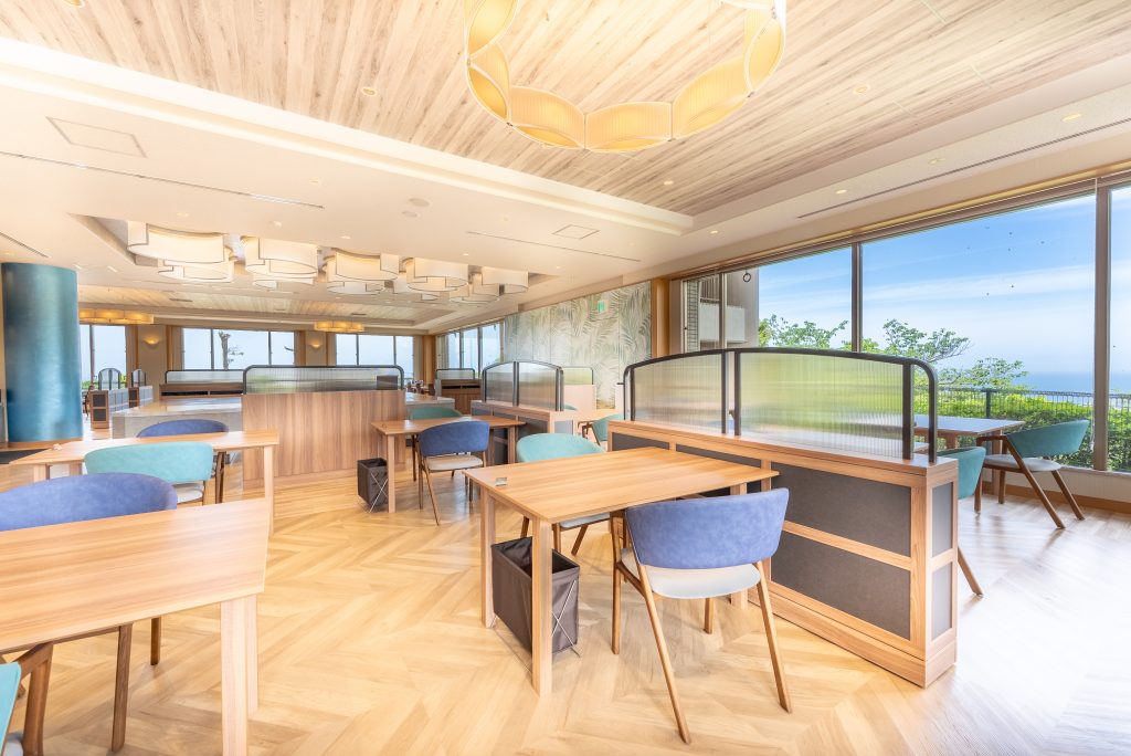 夕食・朝食会場であるダイニングも内容を一新。南国リゾートを感じるブルーを差し色にどこかモダンな雰囲気の空間で楽しいひとときをお過ごしください。