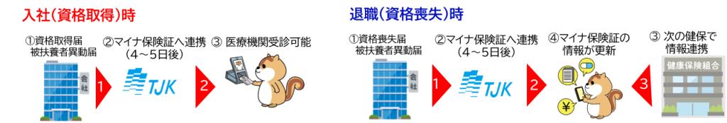 令和6年12月2日(月)の保険証廃止以後は、医療機関等の受診時にマイナ保険証の提示が基本となっていますが 、 マイナ保険証への『資格情報』の反映には、健保組合への速やかな届出※1 が重要です。TJKへ届出された後、通常4~5営業日ほどでマイナ保険証へ資格情報(取得・喪失等)が反映されるため、加入員の皆様が切れ目なく医療機関等の受診ができるよう、できる限りお早めの届出にご協力をお願いいたします。
