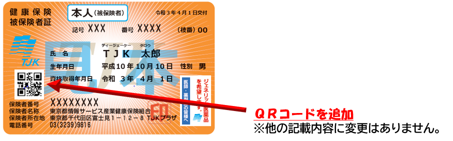 令和4年1月4日発行分より、健康保険証の表面にQRコードを追加しています。業務効率向上のための変更となりますので、健康保険証を使用される際に今までと異なる点はございません。