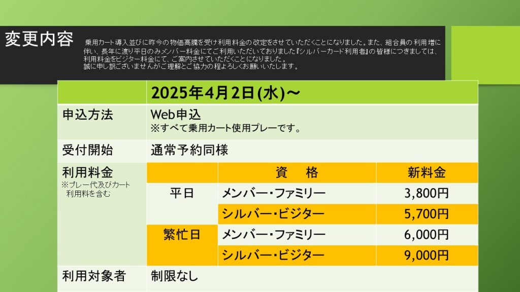 2025年4月2日(水)利用分~全台乗用カートでの運用に伴い、利用料金が変更になります。