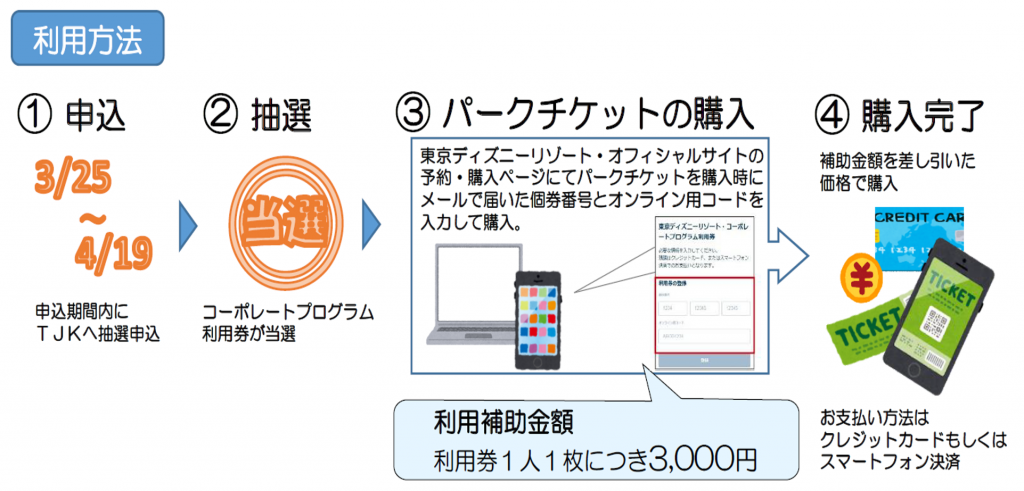 東京ディズニーランド®または 東京ディズニーシ®のパークチケットを各自でご予約・ご購入いただく際に、「利用券」をご利用いただくことで、パークチケット料金から補助金額を差し引いた価格でご購入いただけます。