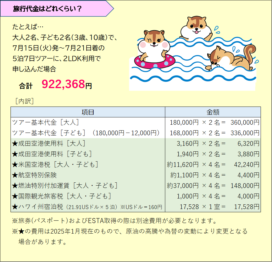 - ハワイ州宿泊税は、USドル=160円として計算した場合の金額です。為替の変動により変更となる場合があります。