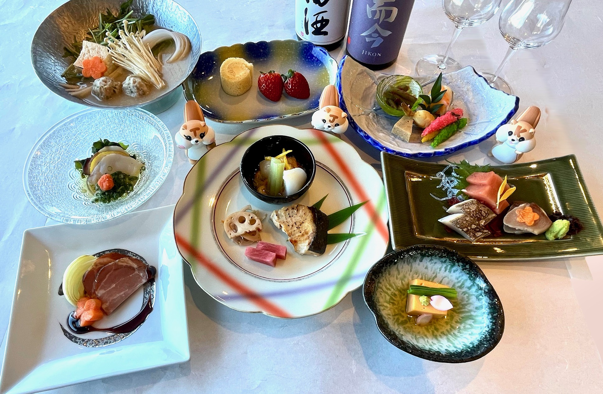 | 前 菜 | 山くらげ梅肉和え 鶏松風 松笠慈姑 海老細魚綱 白魚三色揚げ |