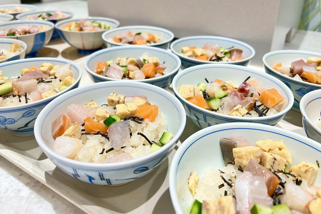 | 食 事 | 千葉県産長狭米 ちらし寿司 梅ちりめん御飯 豆腐赤出汁 香の物 |