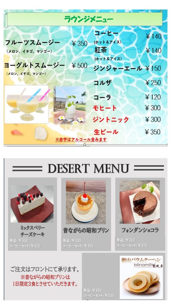 ラウンジ ご到着後は東京湾の景色を眺めながらほっと一息、憩いのひと時をお過ごしください。 ●営業時間 9:00 ~ 17:00 19:30 ~ 20:30 時間によって違った雰囲気をお楽しみいただけます。 ラウンジメニュー