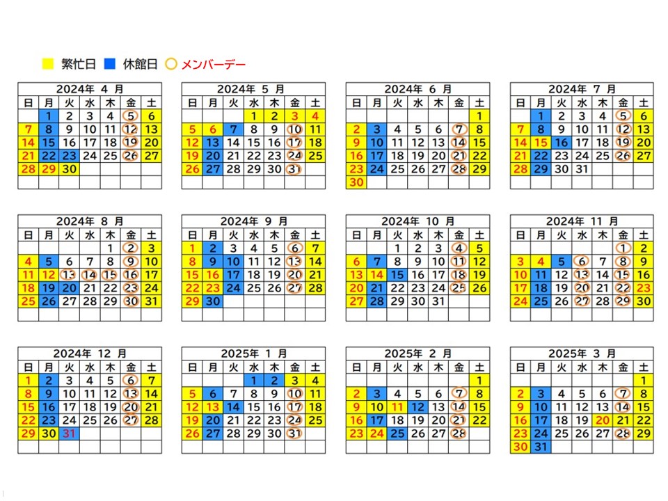 | 休場日 | 毎週月曜日(休日の場合は翌日)および年末年始(12/31~1/1) 詳しくは繁忙日・休館日をご覧ください。 |