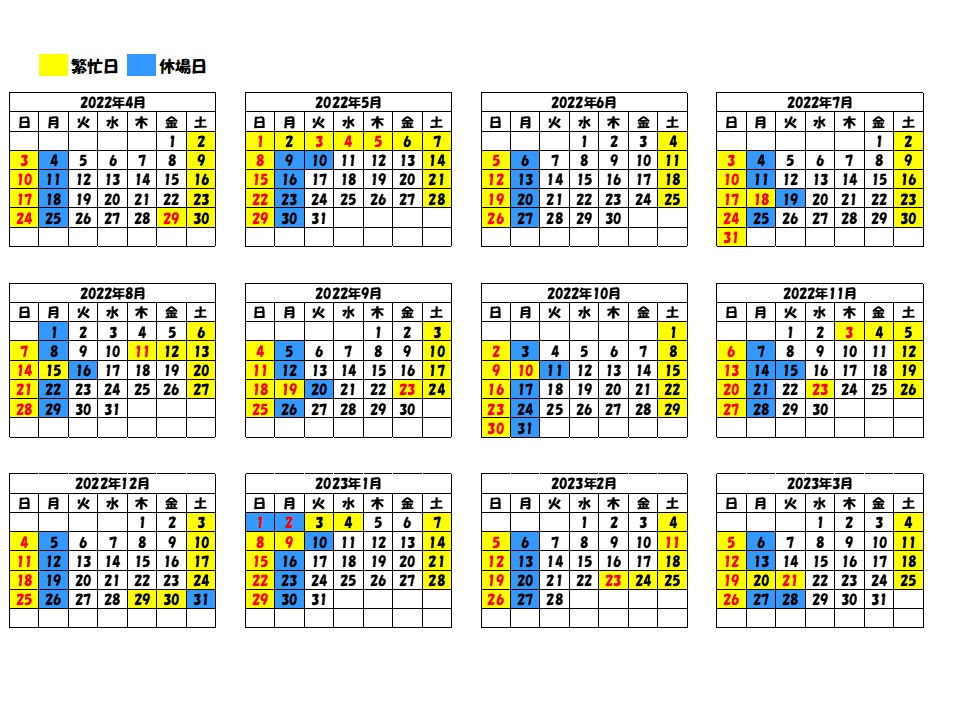 繁忙日につきましては、ゴールデンウイークの中日など、平日でも繁忙日の扱いとなることがありますので、お申し込みの際にお間違えのないようにお願いいたします。 2022年度 2023年度 お申し込み・お問い合わせ先 成田運動場 TJK成田ビューゴルフコース〒286-0127 千葉県成田市小菅661-1TEL 0476-30-3570 FAX 0476-30-3571(受付時間 火~日曜日 10:00~18:00)
