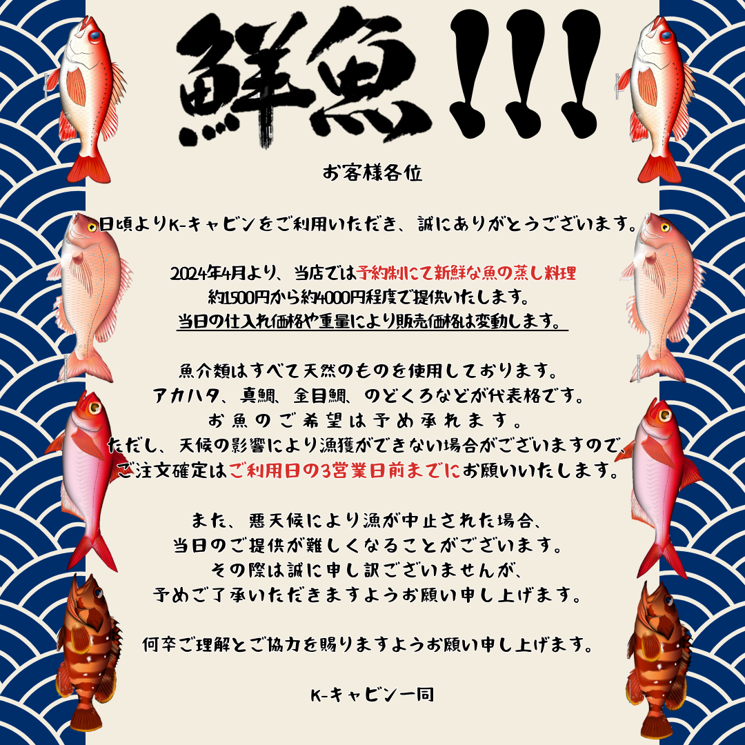 新鮮な天然魚をまるごと蒸し上げ、本格中国料理の味付けでご用意いたします。 魚の種類や価格はご相談ください。 ご予約をお忘れなく! (ご利用日の3営業日前まで)