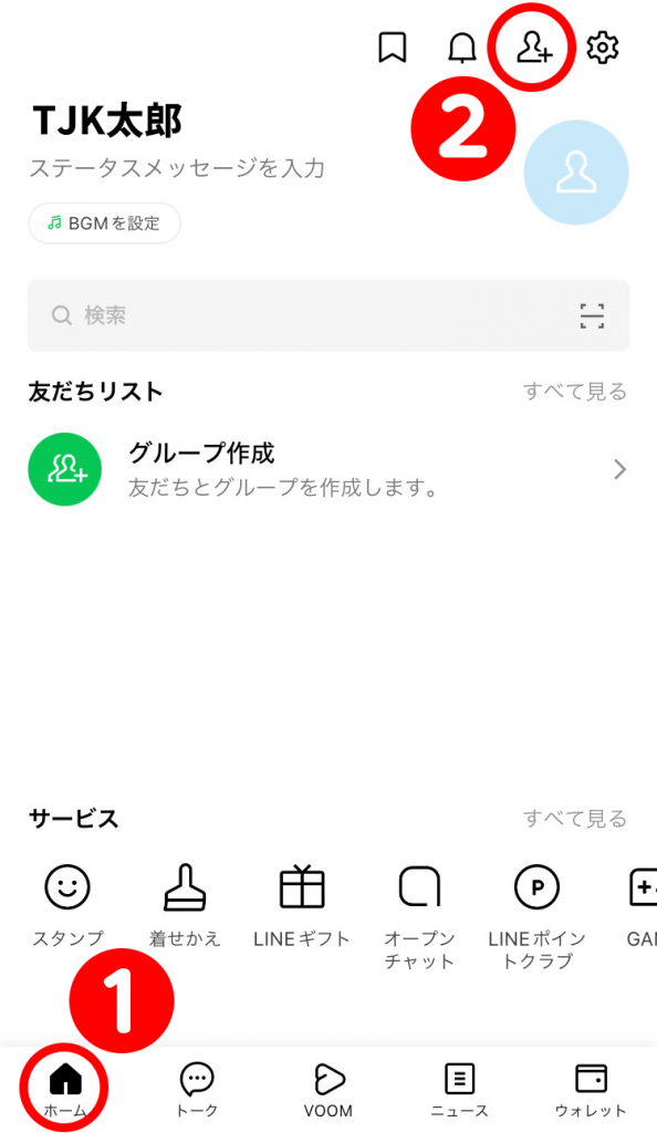 ①「ホーム」のボタンをタップし、②「人マーク+」ボタンをタップします。
